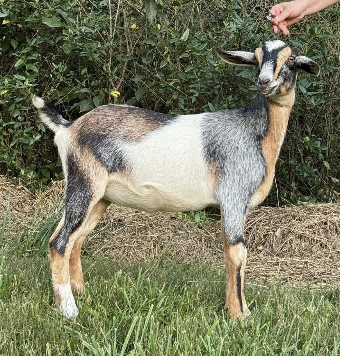 Marilla is the daughter of our beloved former herd queen, who we lost in 2025, and she carries that legacy with quiet strength and grace. She is a lovely, well-balanced doe with a nice rump angle and a beautifully textured udder that milks easily. While more stoic by nature, Marilla has a soft side and is often found snuggled up with guests during goat yoga and cuddle sessions. She is a devoted, reliable mama and a doe we truly cherish on our farm.